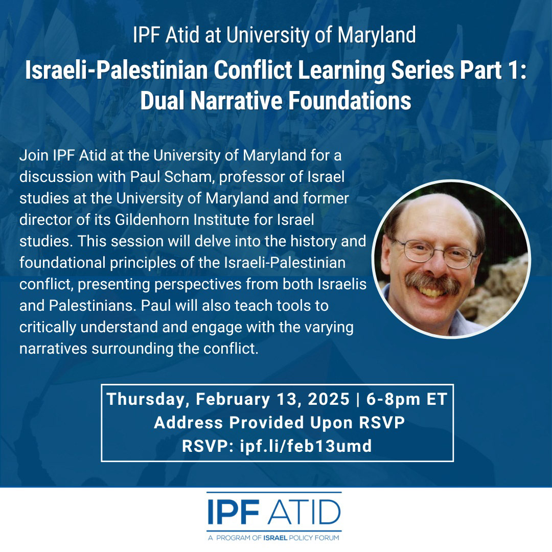 In collaboration with Israel Policy Forum, I hosted a Q&A discussion with Professor Paul Scham. We discussed the dual narratives of the Israeli/Palestinian conflict and how to approach complex discussions of policy with the proper foundation of empathy and understanding.